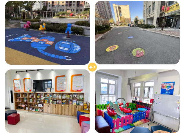 精心打造野外儿童游乐区,新装备摇摇马、跳房子等游戏设备,对主干道古力井盖进行彩绘美化,营建儿童友爱步道,将欢喜延伸至社区儿童日子的“最终一公里”。推动室内“儿童之家”建造,装备滑梯、秋千、海洋球等兴趣设备,铺设柔软地垫保证安全,使之成为孩子们自在探究、亲子互动的温馨六合。