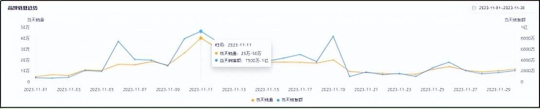 11月,美的销量顶峰首要出现在11月11日-13日,其间11日当天的销量最高。这三天的日销量为10-25万,日销售额均超越了1亿。