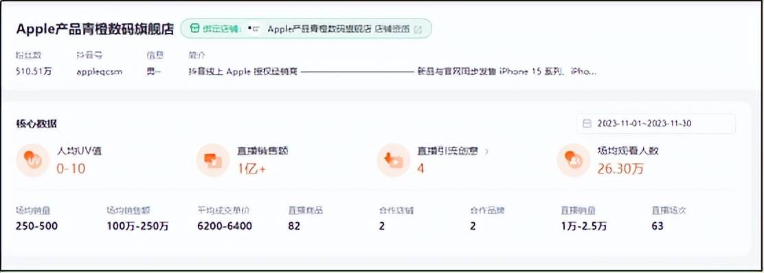 APPLE产品青橙数码旗舰店是苹果的授权经销商,在抖音具有500多万粉丝。多个方面数据显现,该店肆11月的直播场均观看人数为26万,场均销售额为100-250万。
