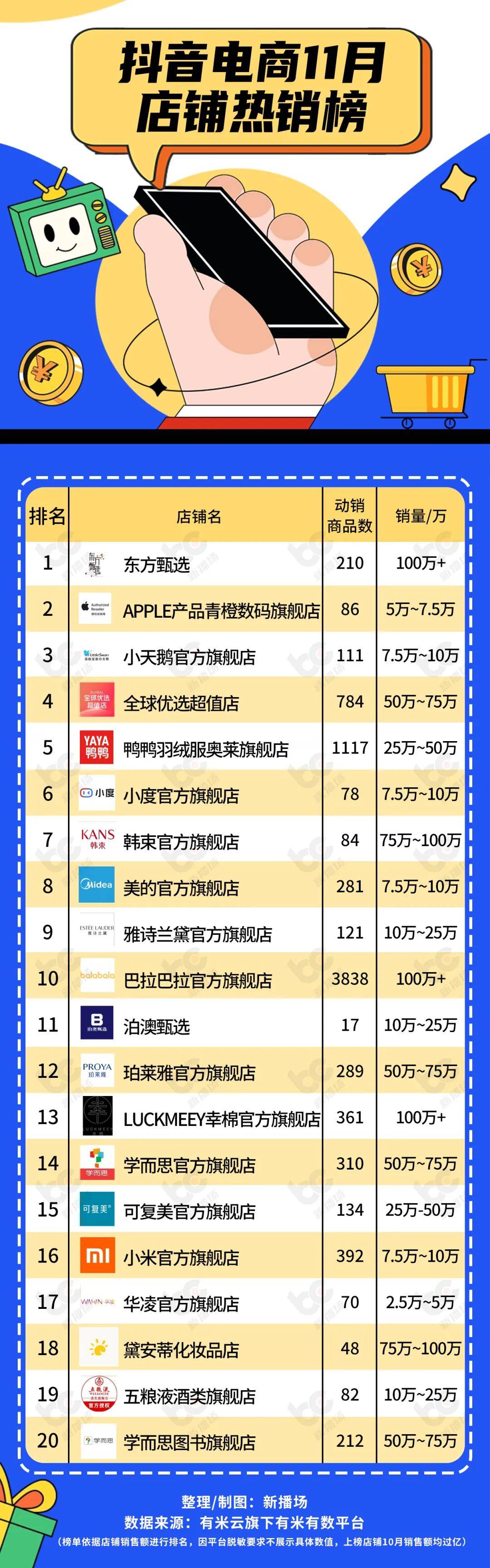 抖音电商11月热销榜!东方甄选登顶店肆榜“服饰鞋包”品牌广告投进最多