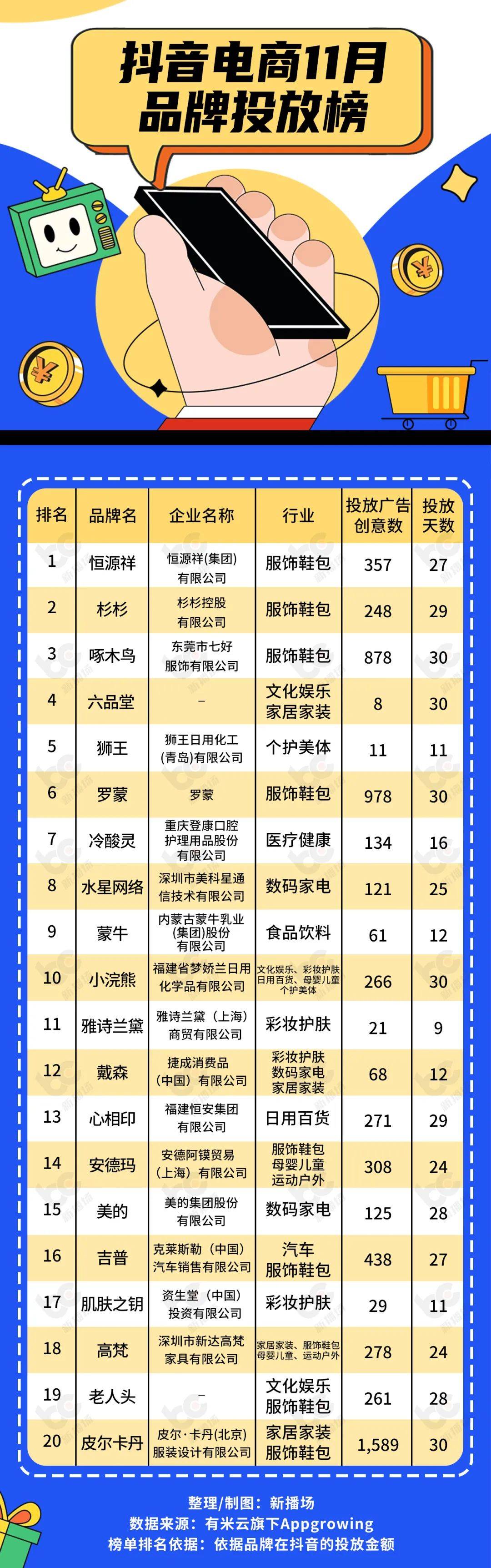 数据显现,抖音电商11月品牌投进榜TOP3分别是恒源祥、杉杉和啄木鸟。榜单中,服装鞋包类品牌最多,有9个。