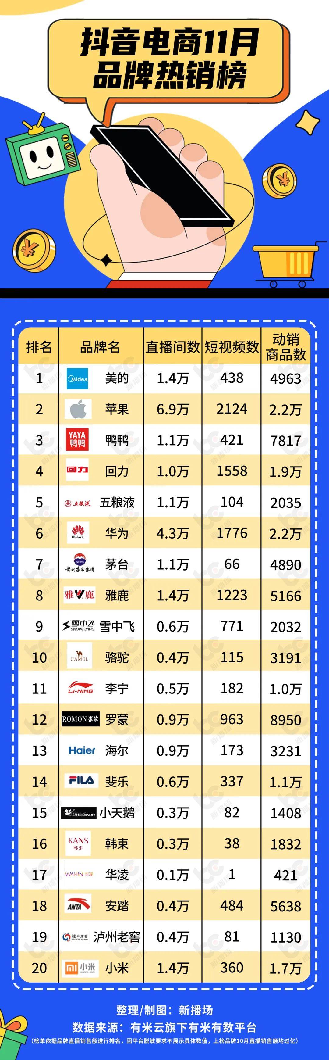 据有米稀有的多个方面数据显现,美的11月的销量超越100万,其掩盖的直播间多达1.4万个,短视频数有438个。而苹果掩盖的直播间多达6.9万个,仍然为榜单中直播间数量最多的品牌。