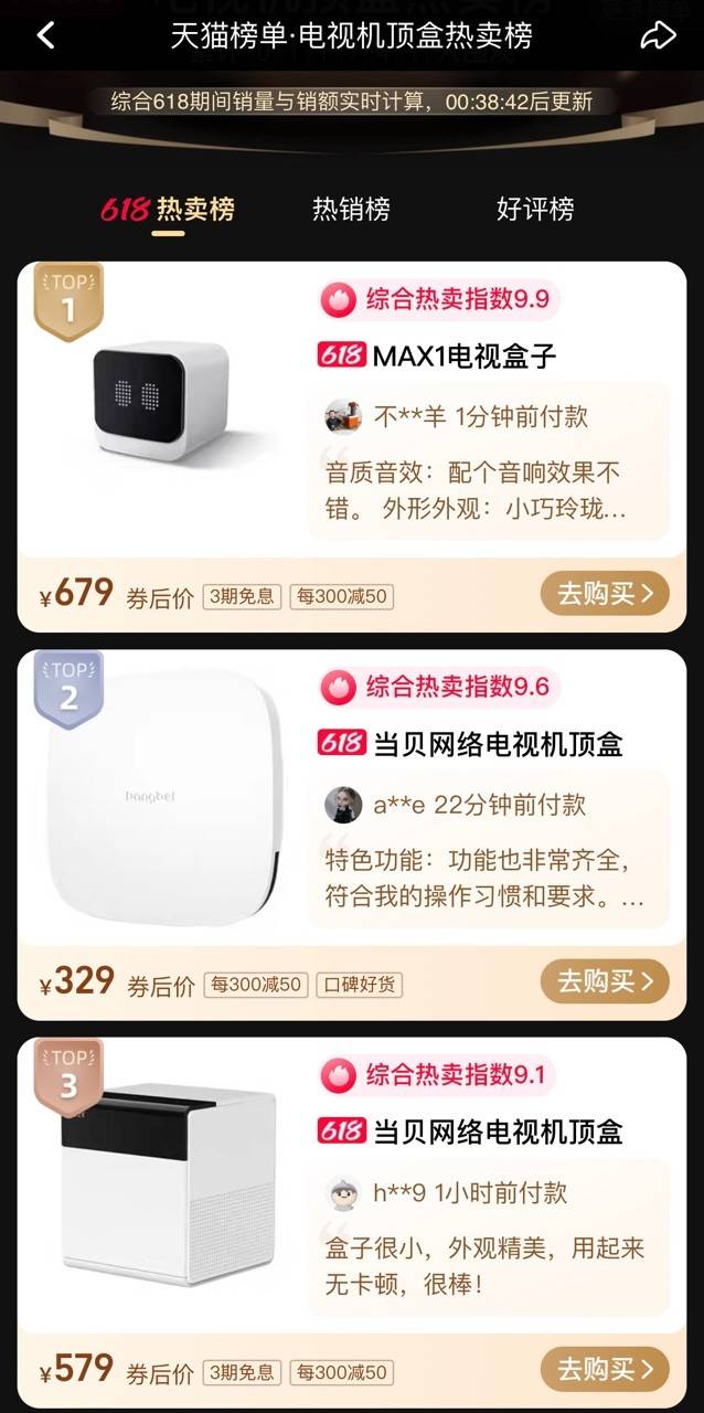 618最新电视盒子热销榜排名:当贝盒子包揽前三名
